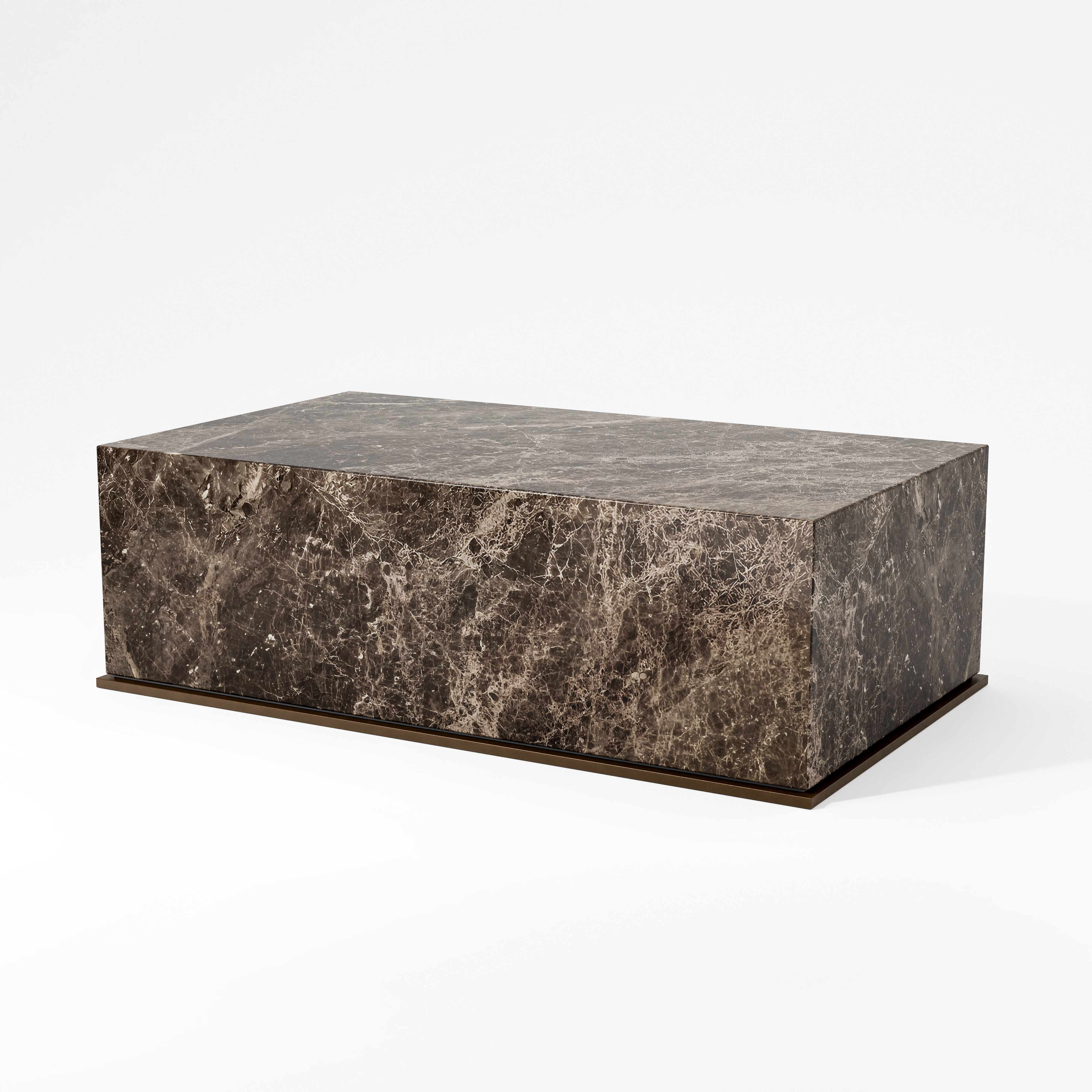 Crafted from precisely mitred stone panels, the piece is elevated on a refined metal plinth, separated by a subtle inset shadow gap.